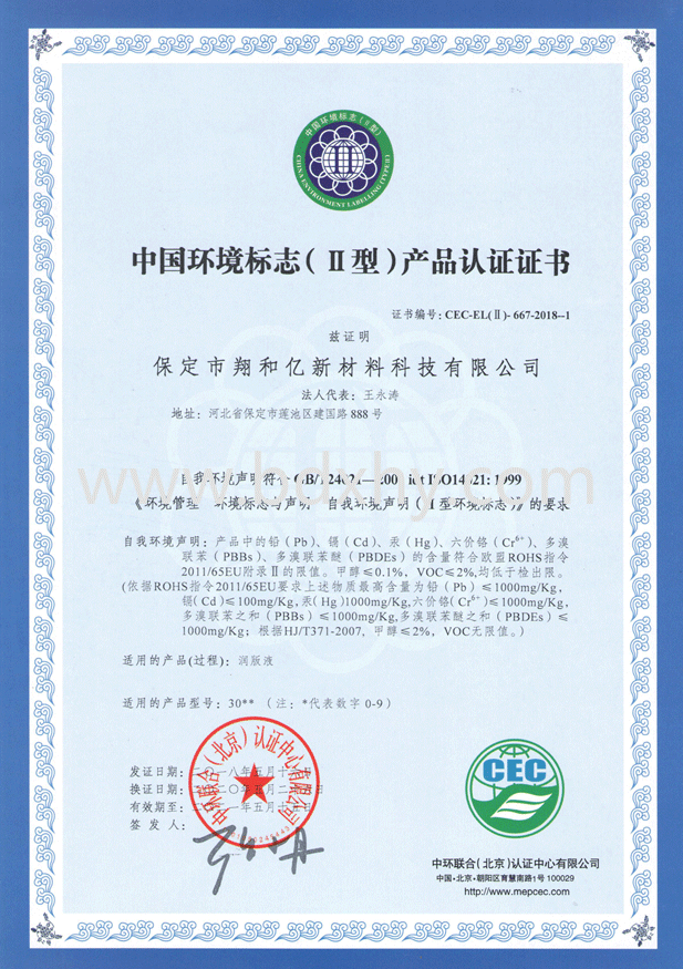 我公司于2018年5月通過中環(huán)聯(lián)合(北京)認證中心對我公司嚴格審查,認證通過并獲得《中國環(huán)境標志(II型)產(chǎn)品認證證書》—認證產(chǎn)品名稱:潤版液,油墨清洗劑。